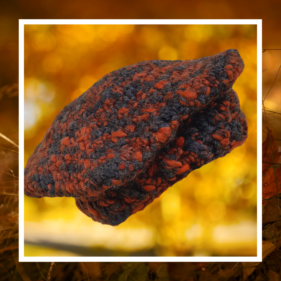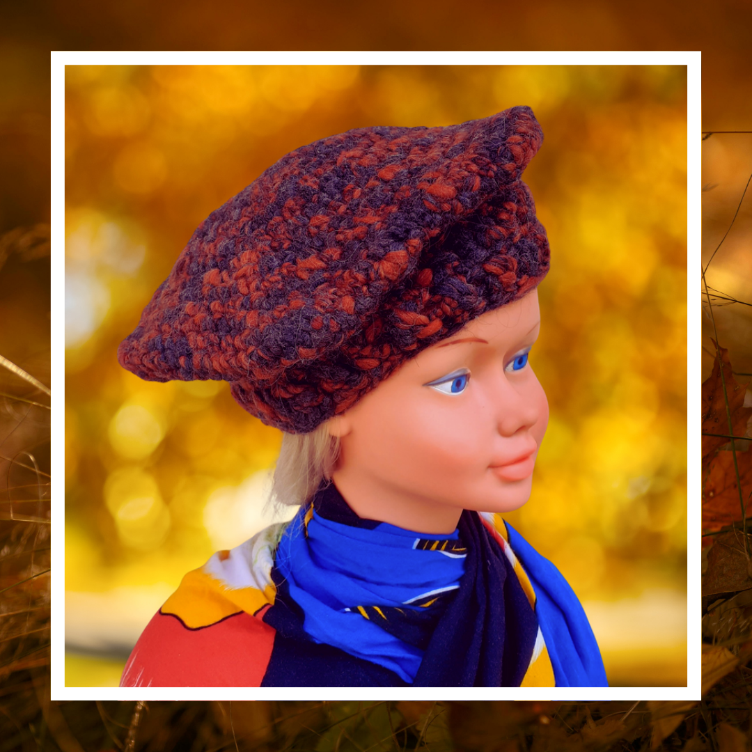 Le Béret Automne Recyclé évoque les forêts en mutation, les feuilles sombres sous les pas et la chaleur feutrée des jours raccourcis.