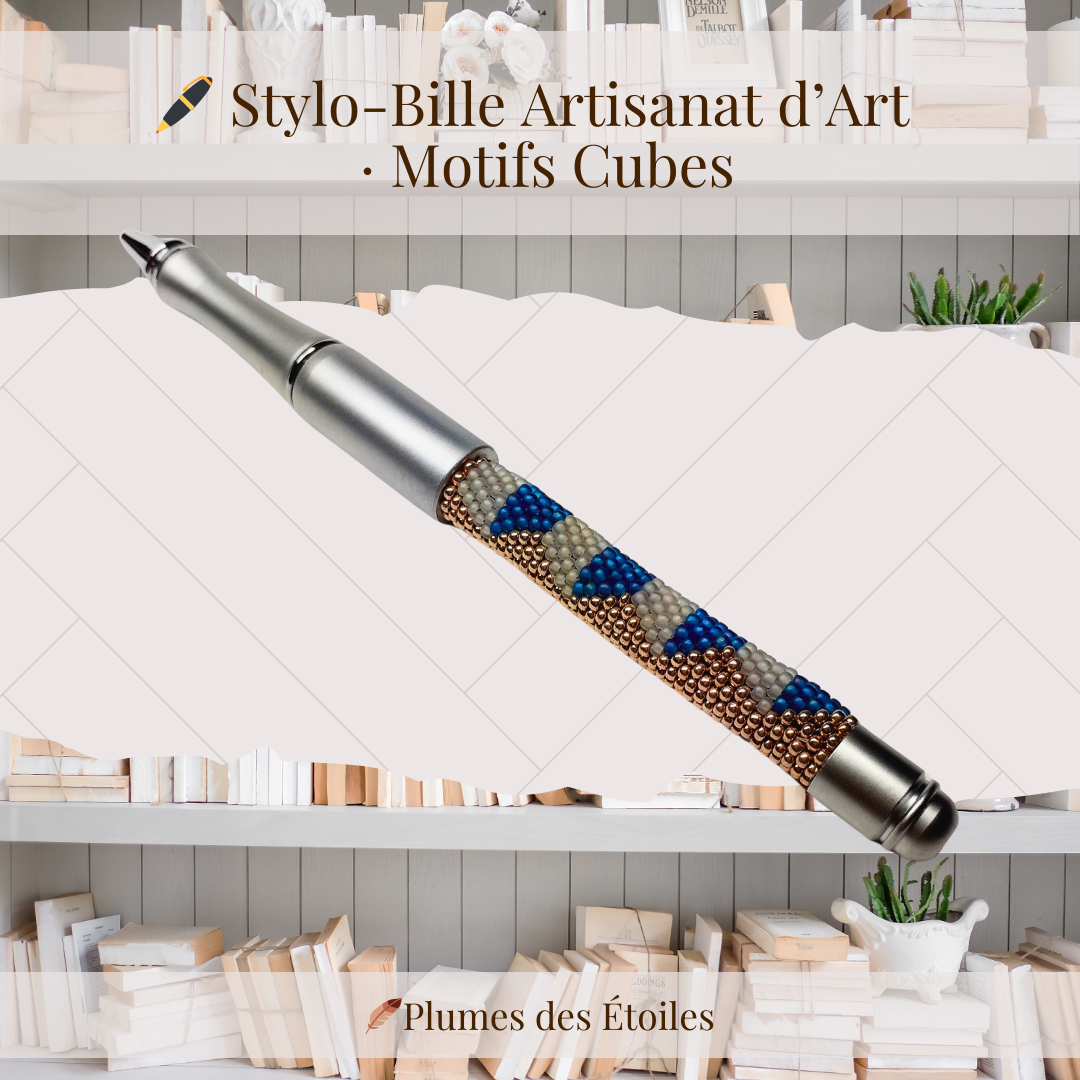 Sa singularité réside dans ses motifs cubes, entièrement réalisés à la main à l’aide de perles Miyuki de haute qualité. Chaque composition est soigneusement élaborée, rendant chaque stylo unique et non reproductible à l’identique.